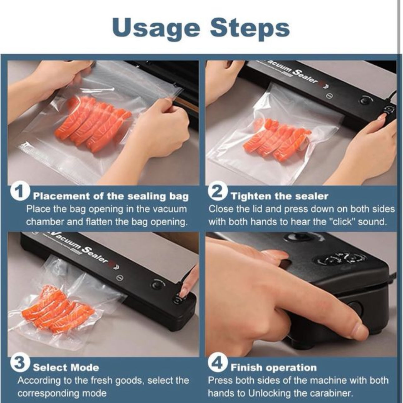 • Sistema de sellado al vacío que elimina el aire de las bolsas, conservando la frescura y nutrientes de los alimentos.