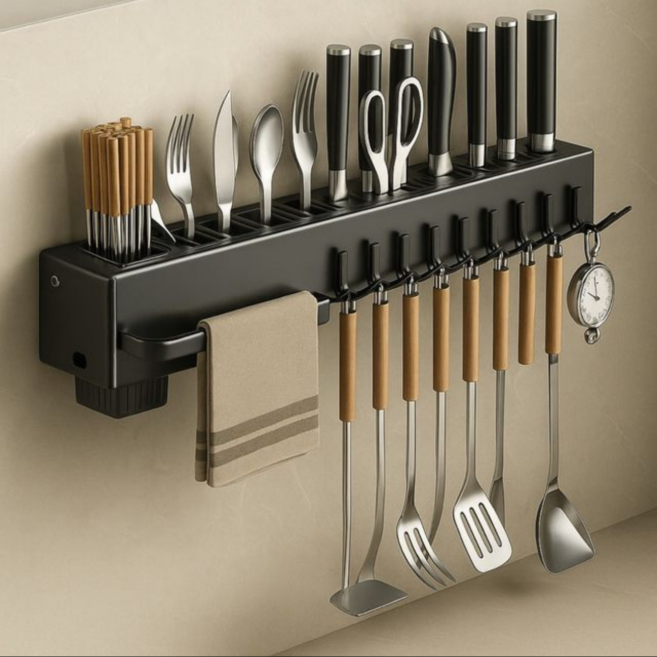 Organiza tu cocina con este práctico estante de pared con ganchos y porta utensilios. Fabricado en material resistente y duradero, incluye múltiples compartimentos para cuchillos, cubiertos, tijeras y palillos, así como 10 ganchos para colgar espátulas, cucharones y otros accesorios. También cuenta con barra lateral para paños. Ahorra espacio y mantén todo a mano. Diseño moderno, instalación sencilla con adhesivo o tornillos (ambos incluidos). Medidas: