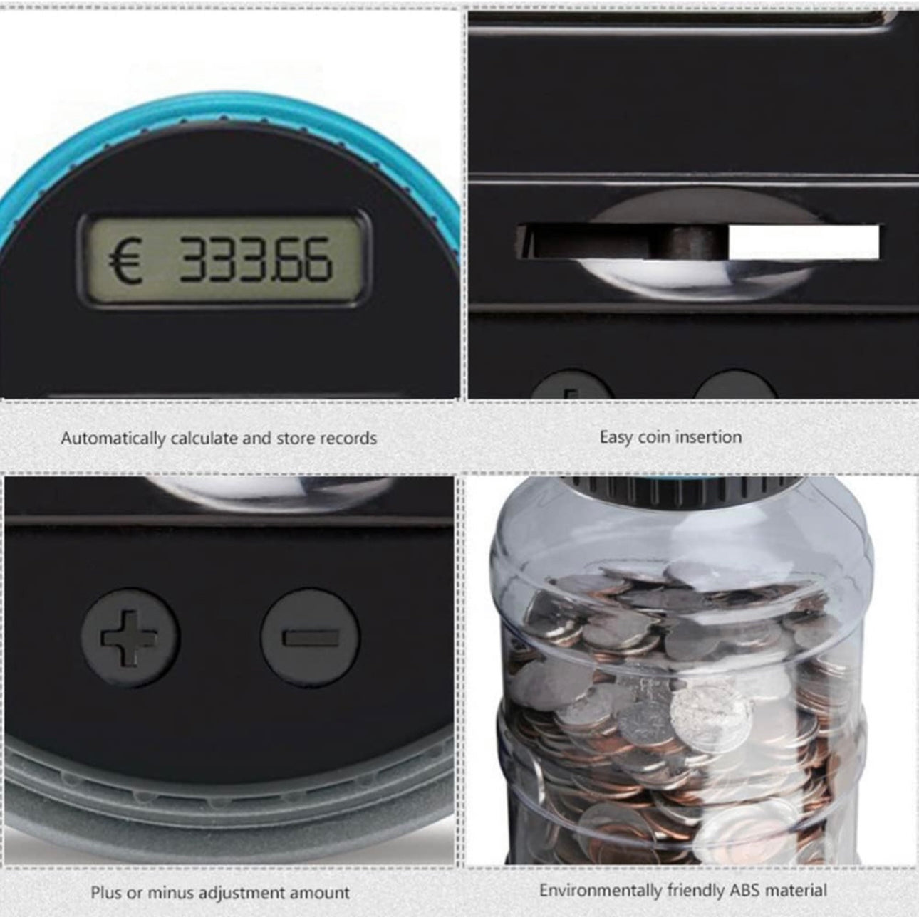 •Pantalla LCD de Alta Precisión: Permite visualizar de forma clara y precisa la cantidad total ahorrada en tiempo real.