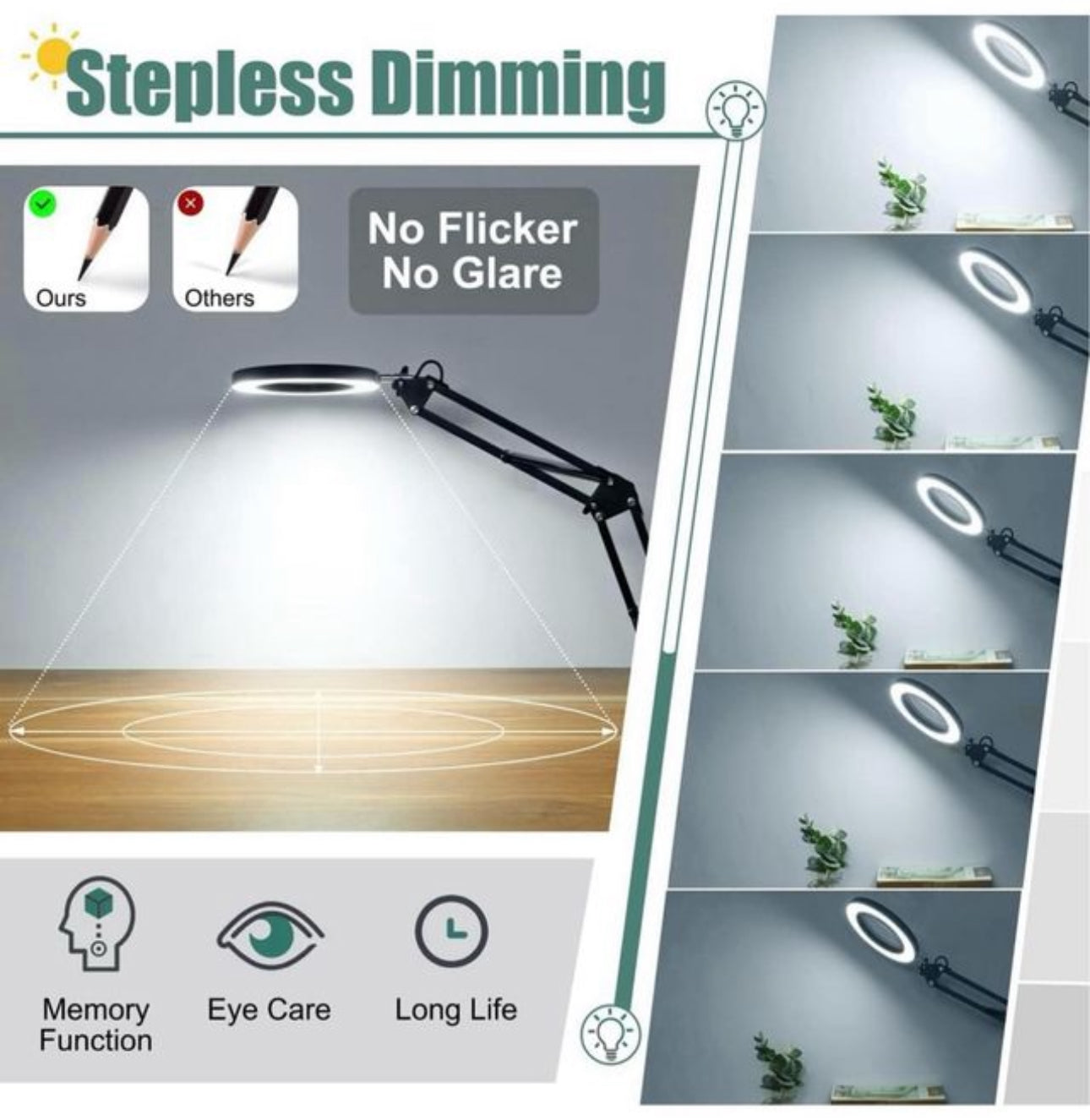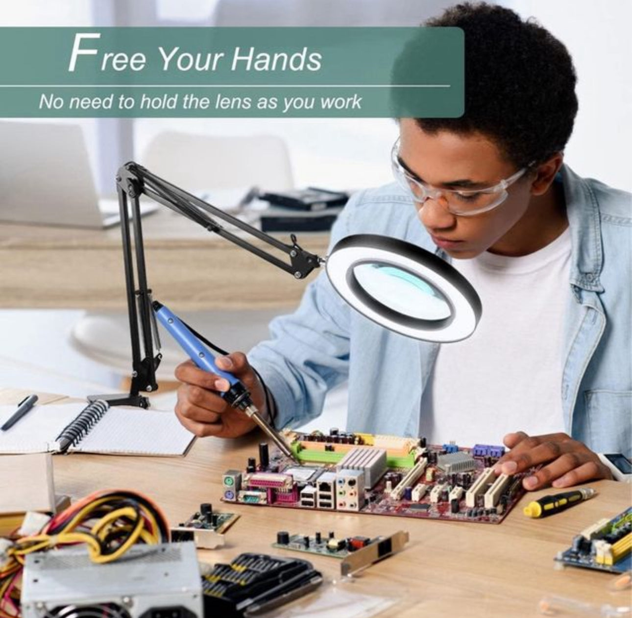Esta lámpara de escritorio multifuncional con lupa es la herramienta perfecta para tareas que requieren máxima precisión visual, como manualidades, electrónica, costura, estética, joyería, lectura y más.