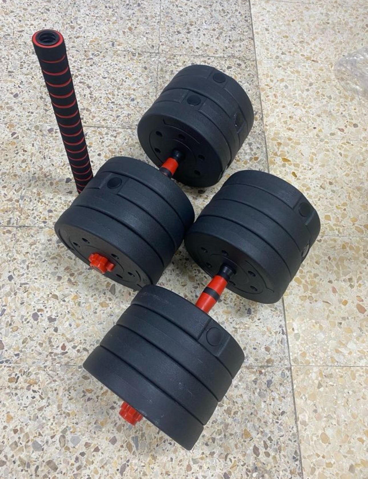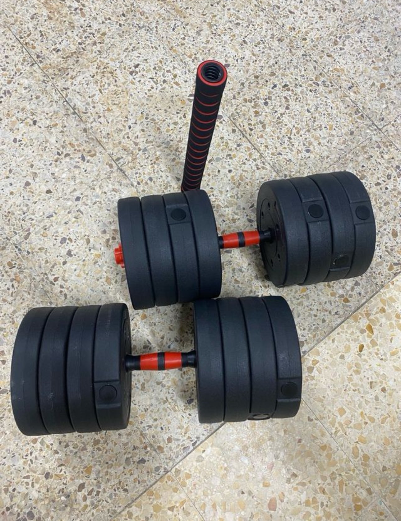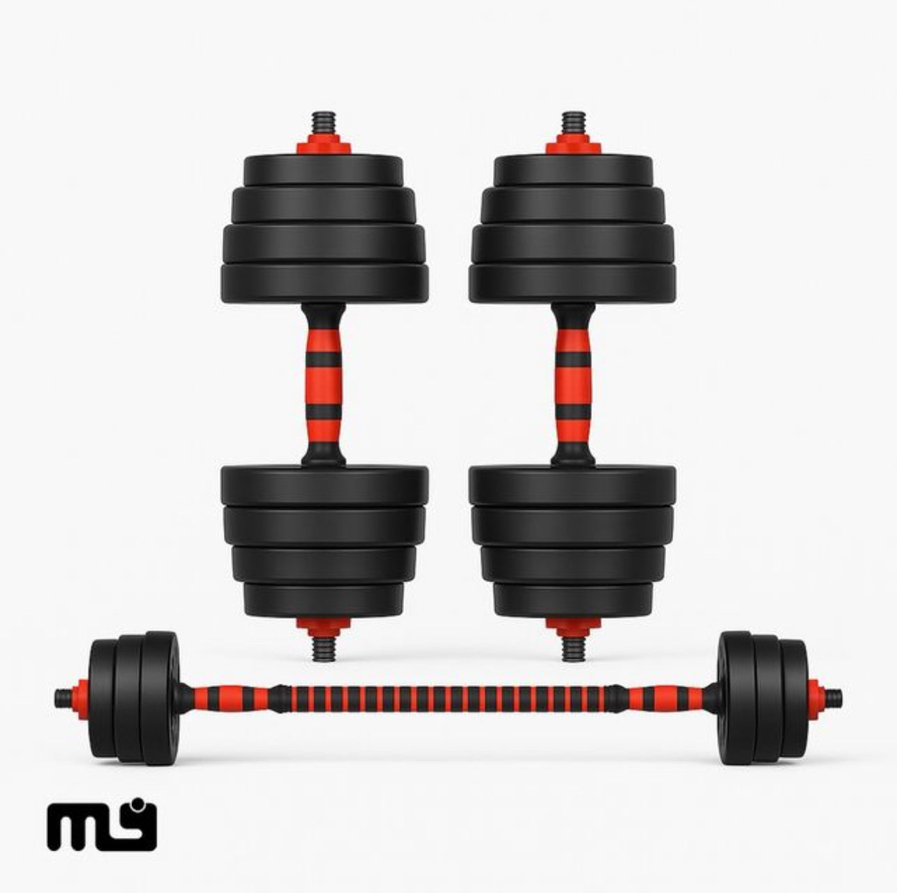 El set incluye dos mancuernas ajustables con discos de peso desmontables, lo que te permite personalizar la carga según tu nivel o el ejercicio que realices. Además, gracias a la barra conectora, puedes convertirlas fácilmente en una barra tipo pesas para trabajar otros grupos musculares como pecho, piernas o espalda.